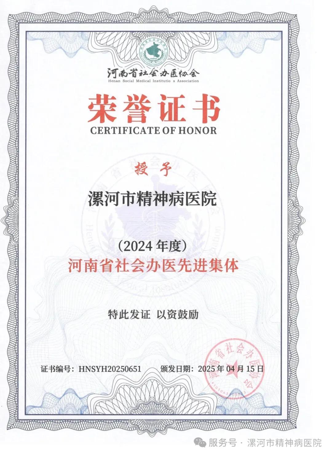 在河南省社會辦醫領域評選中,漯河市精神病醫院憑借卓越的醫療服務水平、專業的醫護團隊和突出的社會貢獻,脫穎而出,榮獲“河南省社會辦醫先進集體”榮譽稱號!這不僅是對該院既往工作的高度認可,更是對全體職工不懈奮斗的最高褒獎。