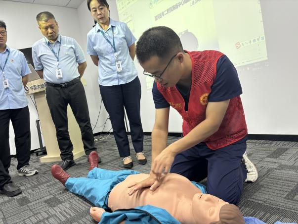 講座結(jié)束后,徐少奇醫(yī)生為大家進行現(xiàn)場演示,拆解CPR操作的全部流程,并現(xiàn)場設置實操環(huán)節(jié),為大家進行指導,糾正“按壓位置錯誤”“力度不足”等常見錯誤,直至掌握正確的急救方法。演練現(xiàn)場氛圍熱烈,職工們都一一輪流進行現(xiàn)場實際操作。