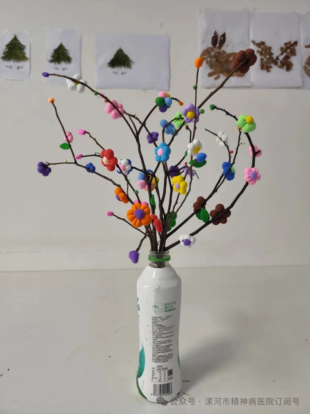 枯樹枝本來干干的,裹上彩色粘土后,突然就“活”了起來——插在洗干凈的飲料瓶里,像一束永遠(yuǎn)不會謝的春天。