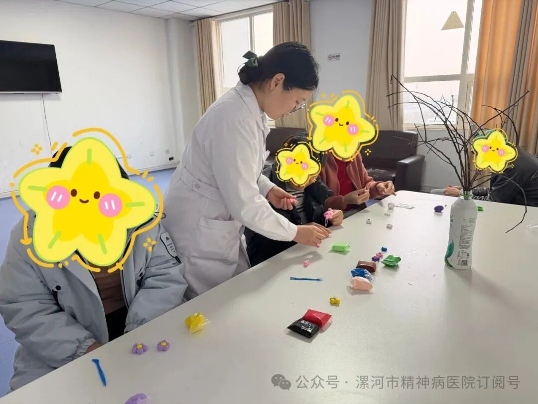 12月1日,漯河市精神病醫(yī)院心身醫(yī)學(xué)科的活動室,有點不一樣,沒有復(fù)雜的工具,只有幾包彩色粘土、撿來的枯樹枝,還有一群帶著期待的患者。醫(yī)護(hù)人員要做的,是把“春天”捏進(jìn)枯枝里,裝在喝完的飲料瓶里~