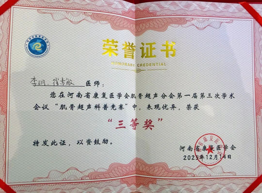 漯河市中醫(yī)院康復(fù)院區(qū)李玥、崔素敏榮獲省康復(fù)醫(yī)學(xué)會(huì)肌骨超聲分會(huì)科普競(jìng)賽三等獎(jiǎng)