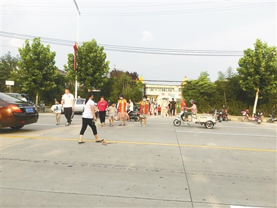 當天下午,記者來到位于太行山路北段東側的孟廟鎮中心幼兒園門口。正值幼兒園放學時間,接送孩子的家長較多,部分家長把車輛停在了學校對面,接到孩子后需要穿過馬路回家。因為路上沒有設置安全警示牌,也沒有減速帶、斑馬線等交通標識,家長帶著孩子在車流中穿梭(如圖)。