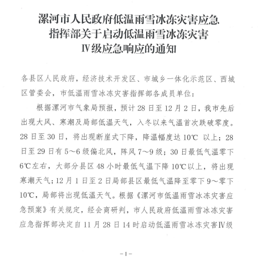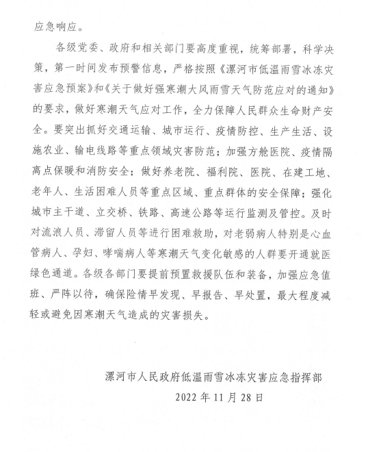 來源:漯河市人民政府低溫雨雪冰凍災(zāi)害應(yīng)急指揮部 時(shí)間:2022-11-28 14:10:00 點(diǎn)擊: