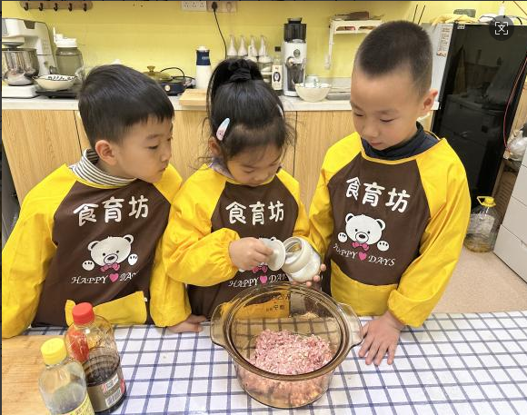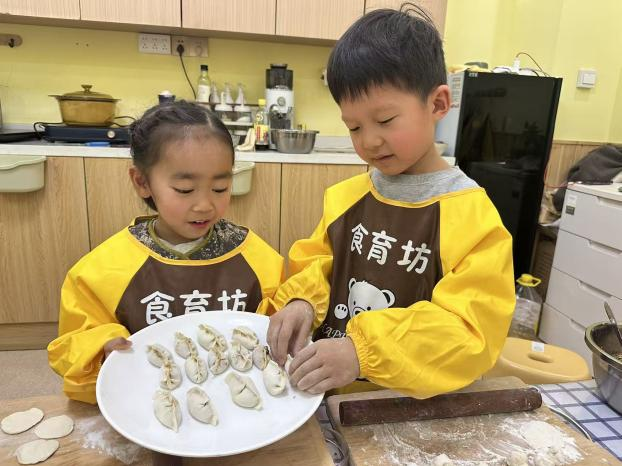 在食育坊里,孩子們穿上小圍裙,變身小小廚師。在老師手把手的指導(dǎo)下小心翼翼地剁著餃子餡,案板上的“噠噠”聲此起彼伏。和面時(shí),孩子們伸手揉、捏、壓,感受著面粉從松散到成團(tuán)的變化,臉上沾了面粉也笑得特別開(kāi)心。