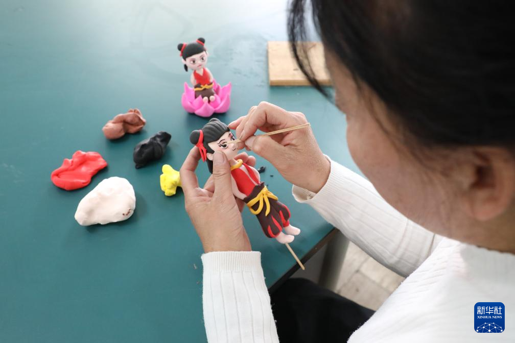 2月20日,泥塑藝人楊愛華在山東省濱州市的一所小學創作哪吒主題泥塑。