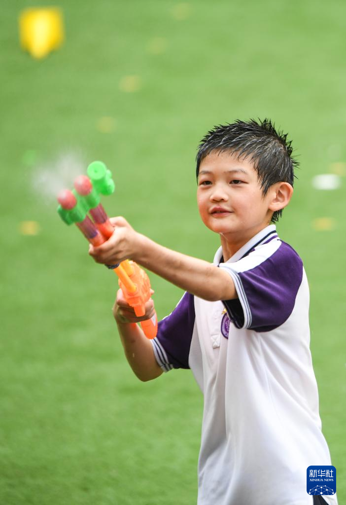 5月30日,重慶兩江新區巴蜀學校學生在“水趣童樂”活動中玩水槍。